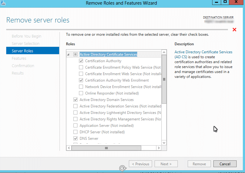 CA rolünün kurulu olduğu sunucu üzerinde bizim vazgeçilmezimiz olan Server Manager konsoluna giriş yapıyoruz. Hemen ardından Remove Roles and Features Wizard kısmından rolümüzü kaldırma işlemine geçiyoruz. Öncelikle aşağıda gördüğünüz gibi Active Directory Certificate Services rolünün kaldırılmasını sağlıyoruz.