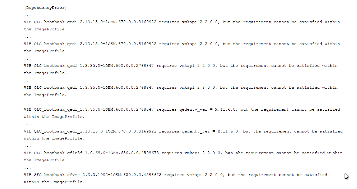 Burada en önemli konulardan birisi ESX hostunuzun markasına göre güncel driverları indirmiş olmaktır. Eğer hostunuz çok eskilerden bu yana versiyon geçilerek bugüne geldiyse, yükseltme yaparken aşağıdaki hataları almanız mümkündür.