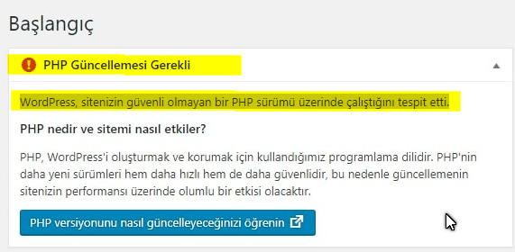 WordPress ile kurmuş olduğunuz web sitelerinizde; eklentileriniz, temalarınız ve PHP sürümünüzün güncelliği uyarı verecek şekilde ayarlanmıştır. Dolayısıyla sizin de PHP sürümünüzü en güncel versiyona taşımanız gerekmektedir.